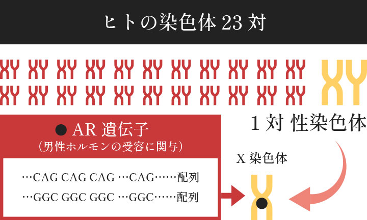 AR遺伝子の配列の中にはC-A-GとG-G-Cという3つずつの塩基が繰り返される部分があります。