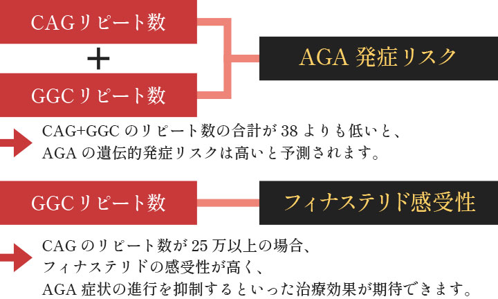 遺伝子検査では、そのCAGとGGCのリピートの合計数でAGAの発症リスクを、GGCの単独のリピート数でフィナステリドの感受性を判定します。