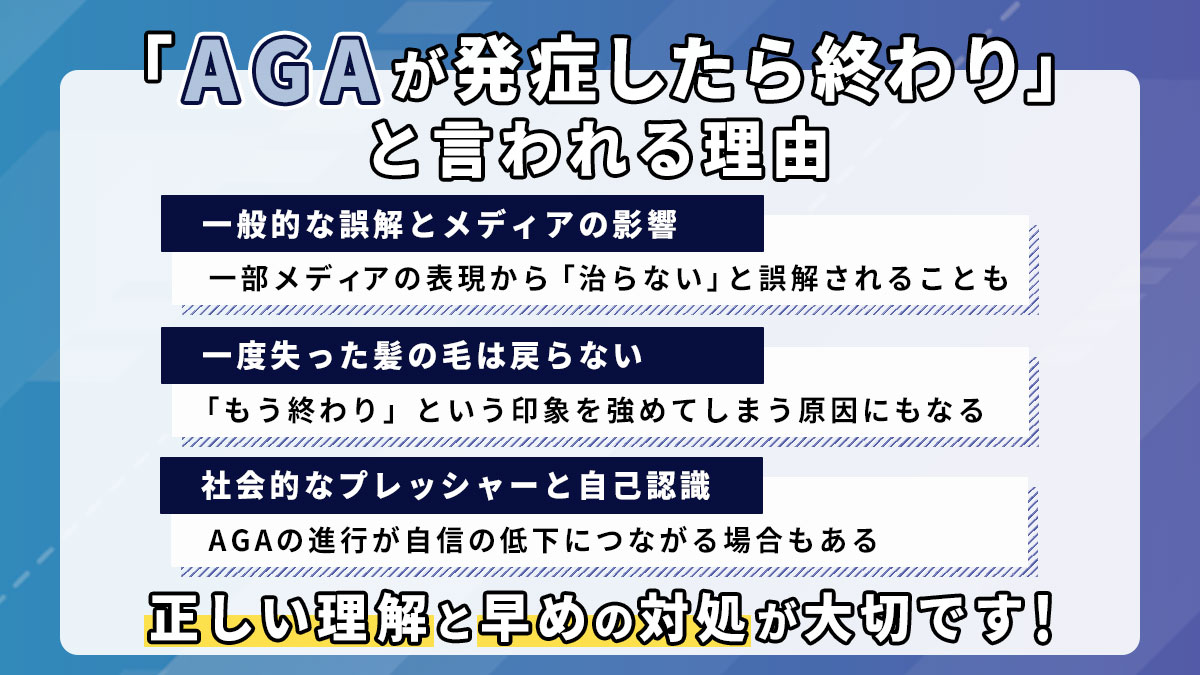 AGAの進行が自信の喪失につながることがあるため、終わりと感じることがあるのです。しかし、AGAに対する正しい知識と対策によって、自信を取り戻せるでしょう。