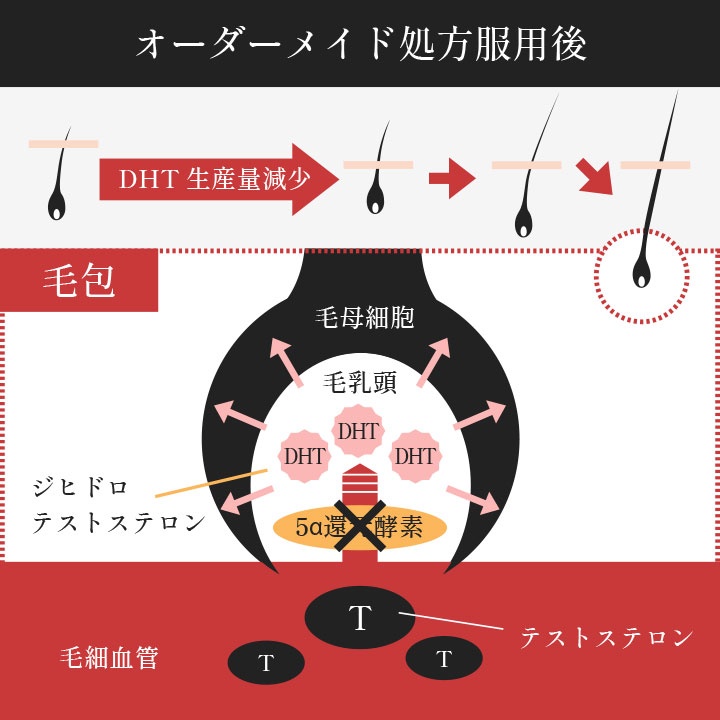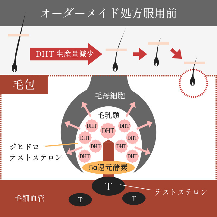 被称作DHT(二氢睾固酮)的“恶性男性荷尔蒙”是AGA的最大成因。DHT(二氢睾固酮)是由被称作“睾丸酮”的男性荷尔蒙与称作5a还原酶的酶相结合所变换而成的物质。