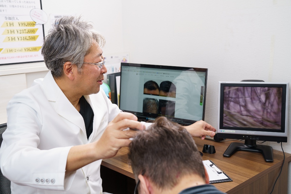 頭髪治療専門ドクターがマイクロスコープで頭皮の診察を行い、現在の頭髪の状態を確認致します。