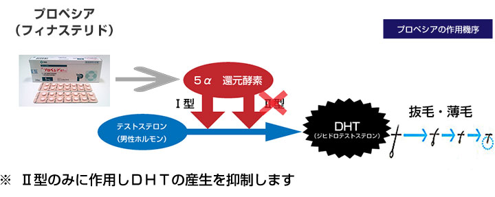 抜け毛が起こる原因のひとつとして、ジヒドロテストステロン(DHT)というホルモンが大きく関わっていると言われており、薄毛を進行させない為には、ジヒドロテストステロン(DHT)の生成そのものを阻害することが重要となります。