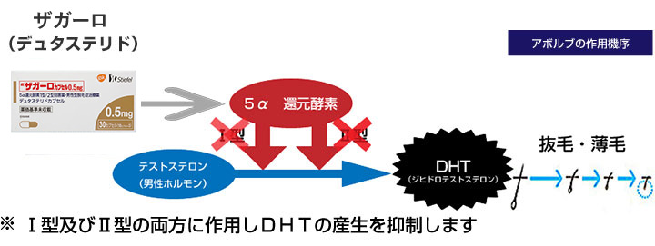 ザガーロには0.1mgと0.5mgの2種類あり、当院ではザガーロ0.5mgのみを取り扱っており、どちらも主成分はデュタステリドで、プロペシアやフィナステリドと同様「5α還元酵素阻害薬」に分類されています。