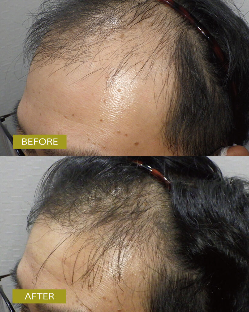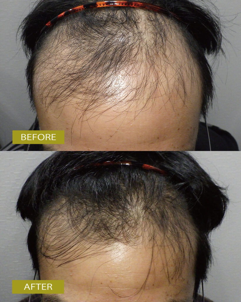 治療前は前頭部の頭皮が透けて見えてしまっており、M字のカーブもかなり急な状態でしたが、現在は額の幅がかなり狭くなっていて、M字部分にも発毛が確認できます!!