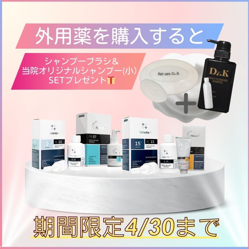 3/7(金)~4/30(水)の期間中、対象の外用薬をご購入の方にシャンプーブラシ&DrKシャンプーミニボトルSETをプレゼント🎁🫧