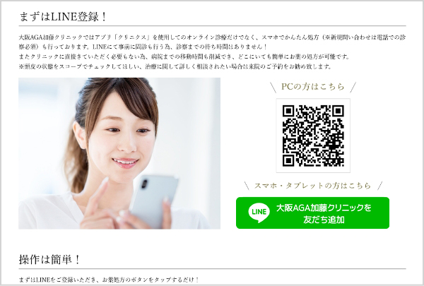 大阪AGA加藤クリニックではアプリ「クリニクス」を使用してのオンライン診療だけでなく、スマホでかんたん処方(※新規問い合わせは電話での診察必須)も行っております。